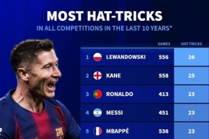 體育資訊11月10日訊 德國轉會市場統計了近10年前十聯賽球員的戴帽次數,并列出榜單。