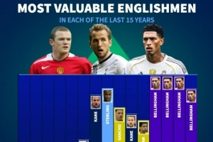 體育資訊1月24日訊 德轉盤點了近15年中,每一年身價最高的英格蘭球員,其中近五年身價最高均為貝林厄姆,具體如下: