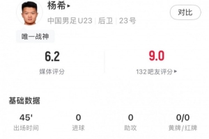 U23國足右邊后衛(wèi)楊希半場表現(xiàn)如下: