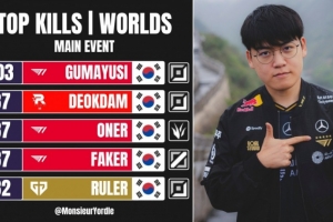 Gumayusi以103排名本屆世界賽第一位,deokdam、Oner、Faker均以87殺并列第二。