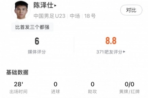 體育資訊1月25日訊 U23亞洲杯決賽,U23國足0-4不敵日本U23,奪得賽事亞軍。替補出戰的陳澤仕數據如下: