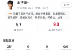 體育資訊1月25日訊 U23亞洲杯決賽,U23國足0-4不敵日本U23,奪得賽事亞軍。替補出戰的王博豪數據如下: