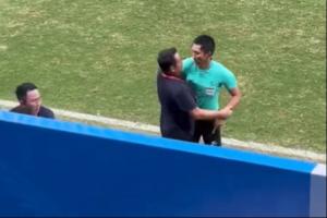 現(xiàn)場(chǎng)實(shí)拍視頻顯示,馬寧準(zhǔn)備向云南隊(duì)替補(bǔ)席的人員出示黃牌,隨后見到被出示黃牌的人員繼續(xù)抗議裁判,迅速跑到場(chǎng)邊。云南隊(duì)主教練立即試圖拉住馬寧,但馬寧最終還是出示紅牌將云南替補(bǔ)席上的工作人員紅牌罰下。