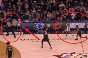 OG·阿努諾比持球就在眼前,恩比德轉身向裁判抱怨