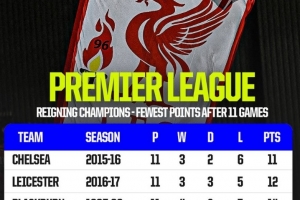 體育資訊11月10日訊 在本輪英超,利物浦0-3不敵曼城,11輪過后只得到18分,OPTA也盤點了英超歷史衛冕冠軍在前11輪過后最少積分情況,本賽季利物浦排在第四,具體如下: