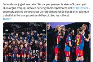 “感謝你們為巴薩女足的榮譽室再添獎杯。更重要的是,感謝你們憑借天賦、日復一日的努力,以及對隊徽的承諾,踢出了如此精彩的足球。你們是最棒的!”