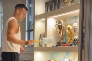 體育資訊1月25日訊 在本輪意甲聯(lián)賽主場大勝比薩后,國際米蘭迎來了短暫的休息時間,國米隊長勞塔羅·馬丁內(nèi)斯在家中打掃了自己的獎杯。