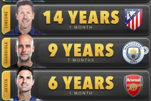 體育資訊1月25日訊 數據網站Score90盤點了五大聯賽球隊現任主帥最長執教時長榜單,具體如下: