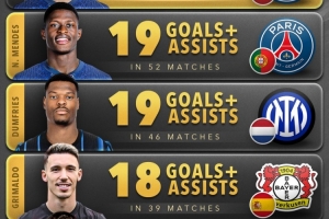 2025年五大聯賽后衛參與進球榜: