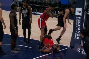 GIF-杰明保護哈登 科林斯誤會了 直接推飛杰明 曼恩也推了科林斯一把 雙方技犯