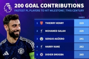體育資訊1月26日訊 曼聯(lián)在本輪英超3-2絕殺阿森納,B費(fèi)送出助攻,也達(dá)成了個(gè)人英超直接參與200球里程碑。數(shù)據(jù)統(tǒng)計(jì)顯示,他也是新世紀(jì)第10快達(dá)成此成就的球員。