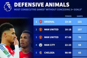 英超球隊各項賽事連續(xù)“單場不丟3球”榜: