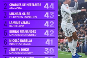 體育資訊1月27日訊 Squawka統計出本賽季歐洲五大聯賽運動戰創造機會排行榜,皇馬當家球星姆巴佩50次位居第一。