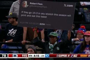 而在此前,一位網友曾表示,如果快船本賽季能夠在任意階段取得15勝3負,他將打印這條推文并吃掉。