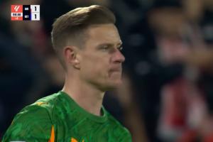 比賽的最后時刻,赫羅納禁區內出現險情,特爾施特根近距離將球撲住,力保球隊不被絕殺。