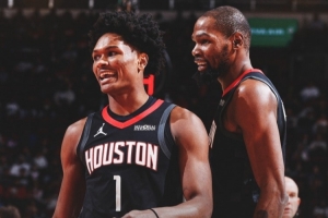 賽后火箭官方曬出贏球海報,阿門·湯普森和杜蘭特登上封面。