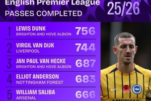 體育資訊11月11日訊 英超聯(lián)賽已經(jīng)進(jìn)行了11輪,squakwa也統(tǒng)計(jì)了本賽季英超成功傳球榜,中場(chǎng)球員僅埃利奧特·安德森和蘇維門迪。