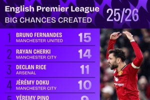 本賽季英超創造重大機會次數榜: