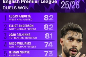 體育資訊11月11日訊 英超聯(lián)賽已經(jīng)進(jìn)行了11輪,squakwa也統(tǒng)計(jì)了本賽季英超成功對抗次數(shù),帕奎塔、安德森、帕利尼亞分列前三。