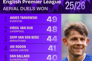 體育資訊11月11日訊 英超聯(lián)賽已經(jīng)進(jìn)行了11輪,squakwa也統(tǒng)計(jì)了本賽季英超空中成功對抗次數(shù),塔科夫斯基力壓范戴克居首。