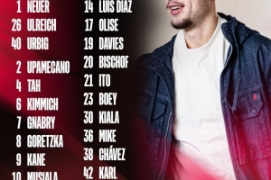 1-諾伊爾、26-烏爾賴希、40-烏爾比希、2-于帕梅卡諾、4-若納坦·塔、6-基米希、7-格納布里、8-格雷茨卡、9-凱恩、10-穆西亞拉、11-尼古拉斯·杰克遜、14-路易斯·迪亞斯、17-奧利塞、19-阿方索·戴維斯、20-比朔夫、21-伊藤洋輝、23-博伊、30-基亞拉、36-邁克、38-查維斯、42-卡爾、45-帕夫洛維奇