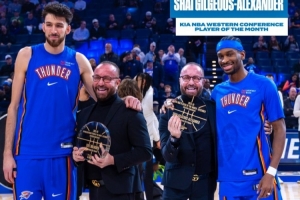 賽前,雷霆球星亞歷山大領取了12月的月最佳獎杯,霍姆格倫則領取了12月月最佳防守球員獎杯。