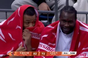 終場前3分58秒,北京以72-82落后,當(dāng)轉(zhuǎn)播方鏡頭給到場邊北京兩名外援時,斯佩爾曼和馬帝昂的臉上都洋溢著笑容,前者還邊說話邊捂嘴笑。