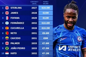 體育資訊1月29日訊 德轉統計切爾西隊內的年薪排行,剛剛官宣離隊的斯特林此前年薪1950萬歐排名隊內第一,里斯·詹姆斯、福法納排名前三。