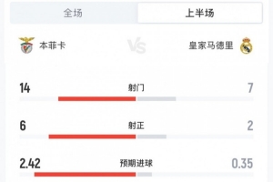 體育資訊1月29日訊 歐冠聯(lián)賽階段第8輪,本菲卡主場(chǎng)對(duì)陣皇馬,半場(chǎng)主隊(duì)2-1領(lǐng)先,兩隊(duì)半場(chǎng)數(shù)據(jù)如下(本菲卡在前):